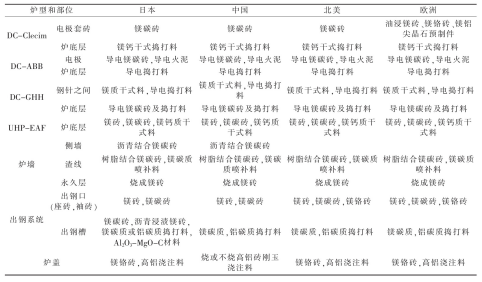 摘 要:由三根電極的普通交流電弧爐發(fā)展為超高功率(UHP)及一根電極的直流(DC)電弧爐,爐體結構有一些改變。針對各部位的損毀因素,內襯用的耐火材料也有所發(fā)展。例如普通電弧爐的爐頂用高鋁磚、爐墻鎂磚砌筑,而UHP及DC電弧爐采用大面積水冷爐頂、爐墻,爐頂三角區(qū)采用剛玉澆注料或預制件,爐墻用鎂碳磚,蝕損嚴重部位采用噴補作業(yè)。還介紹了日本等一些國家DC和UHP的各種爐型用耐火材料。煉鋼電弧爐是以電極端部和爐料之間發(fā)生的電弧為熱能進行煉鋼的設備。電弧爐以廢鋼為爐料直接煉鋼,與礦石煉鐵后再煉鋼相比,基建投資少,節(jié)能60%、節(jié)水40%、減少廢氣排放86%、減少廢渣97%[1]。交流電弧爐歷史悠久,交流電是通過三根石墨電極輸入爐內,在電極下端與金屬料之間產生電弧,利用電弧高溫直接加熱爐料,使煉鋼過程得以進行。供電功率越高,爐料熔化速度越快,降低能量消耗越多,因此出現超高功率(UHP)電弧爐。在超高功率的基礎上發(fā)展了直流(DC)電弧爐煉鋼。直流電弧爐是以一根石墨電極的端點為陰極,爐底為陽極,石墨電極位于爐膛中心部位。與UHP相比設備結構簡單,建設費用低,熔池中的電流與熱量分布比較均勻,不存在過熱區(qū)域,因此耐火材料損耗比較小、節(jié)能且噪音小等。目前,煉鋼電弧爐向大型化、控制自動化方向發(fā)展。我國的電弧爐主要用來生產合金鋼。煉鋼水平與工業(yè)發(fā)達國家相比差距較大,如2015年我國電爐鋼占粗鋼總產量的6.1%,2020年有所提高,但也不超過10%,與世界平均水平的30%相比還有較大差距。我國已經引進先進水平的UHP和DC電弧爐,隨著經濟發(fā)展,工業(yè)化程度提高,必然伴以廢鋼資源數量增加,同時發(fā)展鐵礦石直接還原煉鐵技術,代替廢鋼,增加電弧爐煉鋼的爐料,還有核電的發(fā)展,使電弧爐煉鋼有了物質保證。電弧爐的內襯是耐火材料構成的,隨著UHP和DC技術的發(fā)展,需要新型優(yōu)質耐火材料與之相配套。有人說[2]:沒有優(yōu)質爐襯、爐底耐火材料支持長壽爐齡,超高功率電弧爐就無法發(fā)揮高效生產的優(yōu)勢。爐底耐火材料是直流電弧爐得以實現的必要條件,反映了煉鋼與耐火材料技術的互相影響,互為依存,在電弧爐煉鋼系統(tǒng)優(yōu)化生產中有不可分割的作用。1 電弧爐的結構變化傳統(tǒng)的電弧爐由爐頂(又稱爐蓋)、爐墻、爐坡、爐底和出鋼槽構成,全部用耐火材料構筑,外包鋼制爐殼。爐墻一側設有爐門,另一側為出鋼口,并與出鋼槽相連。而UHP和DC電弧爐采用偏心爐底出鋼,使爐體由傾動式改為固定式,爐底有供氣攪拌設置,爐頂安裝氧-燃料燒嘴,在爐底偏心位置設置出鋼口,代替出鋼槽。由于取消了傾動設備,擴大了水冷面積,緩和了爐襯的損毀,適當降低了出鋼溫度,并縮短了出鋼時間,從而降低生產成本。爐墻采用鑲砌水冷箱式水冷套措施,其內表面噴涂一層耐火涂料,使其掛渣形成保護層,可有效降低耐火材料消耗,但電耗可能增加。國外有的電弧爐功率達1 000 kV·A/t以上,爐墻壽命達2 000爐次以上,水冷爐蓋壽命達4 000爐次,降低耐火材料消耗60%以上。2 耐火材料內襯的損毀因素電弧爐內襯的耐火材料長期處于高溫、熔渣侵蝕和急熱急冷狀態(tài)下,工作條件極其惡劣。在煉鋼的熔化期和氧化期,不致于因高溫損壞爐襯,但在還原期的鋼液溫度相當高,又受電弧直接輻射(有時溫度達4 000℃以上),爐襯很容易造成熔融損壞。出完鋼裝料時,爐襯溫度突然下降,裝完料開始送電,溫度又逐漸升高,這種急冷急熱是爐襯剝落的直接原因,主要是爐頂容易剝落。耐火材料內襯損毀的主要因素包括[3]:(1)化學侵蝕。FeO或渣中SiO2與耐火材料中的CaO、MgO之間的化學反應,使爐襯變?yōu)槿墼鴮е聯p毀。(2)耐火材料內襯中的碳成分被含氧成分(如FeO、O2、MgO等)氧化,導致耐火材料脫碳而損毀。(3)沖刷和機械沖擊。鋼水或熔渣流過耐火材料表面,以物理性磨損或沖刷爐襯,而導致內襯損毀;在出鋼口、渣線、電極口或排氣口平臺等沖刷嚴重,廢鋼等爐料吊入往往撞擊爐襯而損毀。(4)水化。在生產過程中,往往會出現爐頂或爐墻漏水或滲水,還有水蒸氣,與堿性耐火材料中的MgO、CaO進行水化反應,使內襯損毀。3 電弧爐用耐火材料根據電弧爐的結構,由于各部位承受的熱負荷大小不同,與熔渣、鋼水接觸作用及機械損壞程度存在差異,不同部位必須采用不同的耐火材料[4]。3.1 爐頂(蓋)我國中小電弧爐普遍采用燒成或不燒高鋁磚,局部用高鋁質或剛玉質不定形耐火材料預制件。大型超高功率電弧爐和直流電弧爐采用水冷技術,除三角區(qū)外,爐頂耐火材料不是關鍵。三角區(qū)由于強烈熱震及電極熱輻射苛刻,國外普遍采用剛玉質或鋁鉻質搗打料,我國一般用高鋁質或剛玉質搗打料。天津鋼管集團公司150 t超高功率電弧爐,爐頂三角部分(三個電極孔周圍)采用鉻剛玉質澆注料預制件,預先烘烤,現場直接使用,并解決了電極孔定位的難題。還針對氧槍上部損毀較快問題,在該區(qū)域采取局部加厚處理,使爐頂各部分損毀速度基本一致,最高壽命達676爐次。3.2 爐墻(壁)分為一般爐墻、渣線區(qū)和臨近電弧的熱點部位爐墻。一般爐墻主要用鎂磚、白云石磚砌筑,也有用不燒鎂磚和瀝青結合的鎂質及白云石質搗打料。超高功率和直流電弧爐冶煉特殊鋼的爐壁使用鎂鉻磚和優(yōu)質鎂磚砌筑。